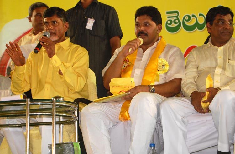 Telugu Desam Party president N Chandrababu Naidu addresses the delegates on the second day of the party’s annual conclave, the Mahanadu, at Gandipat in Hyderabad on Saturday. INN Photos