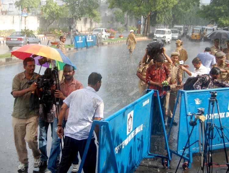 Media persons scamper for cover as a sudden downpour catches them off guard on the Raj Bhavan Road in Hyderabad on Saturday. INN photos