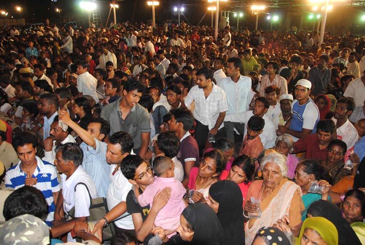 Asthama Patients from various parts of India holding small fish in packets wait for their turn at the Fish Prasadam to be administered by Bathani family members at exhibition grounds in Hyderabad on Wednesday.