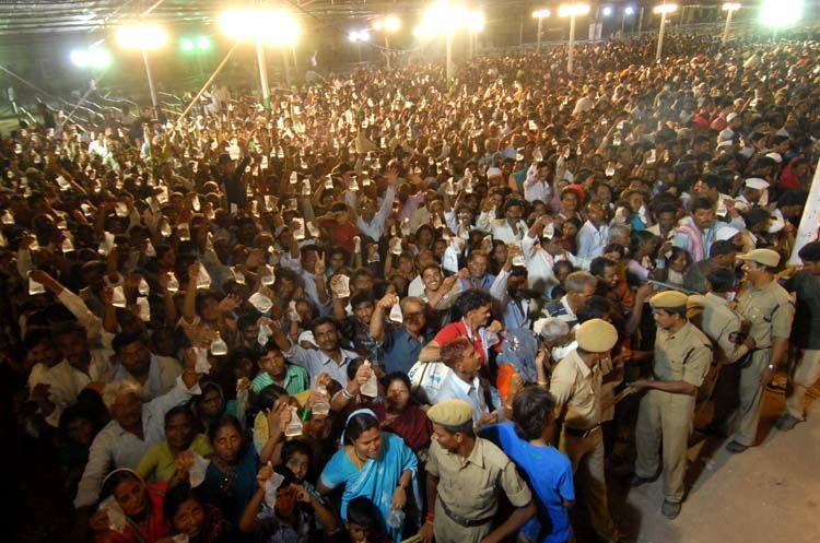 Asthama Patients from various parts of India holding small fish in packets wait for their turn at the Fish Prasadam to be administered by Bathani family members at exhibition grounds in Hyderabad on Wednesday.