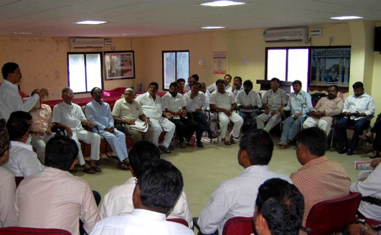 TRS president K Chandrasekhar Rao attends the TPJAC steering committee meeting in Hyderabad on Thursday. TP JAC Convenor Kodandaram, TNGOs president Swamy Goud and others are also seen. INN Photos