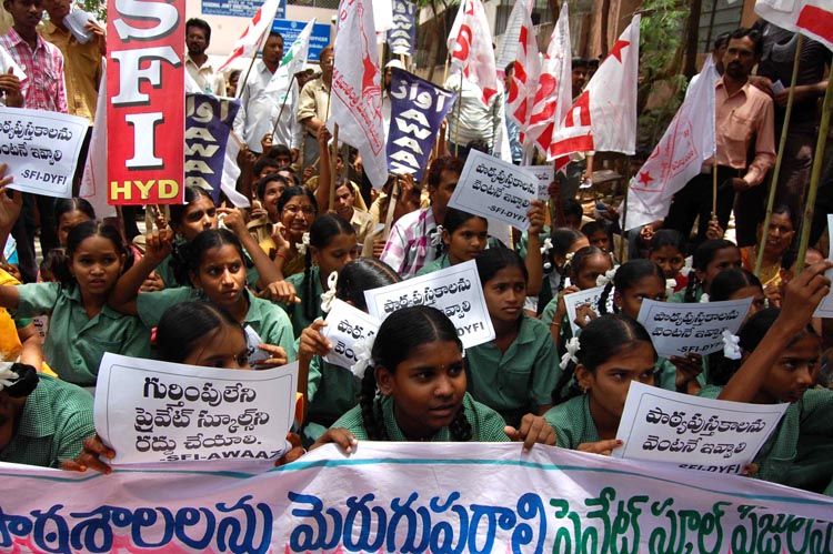 Students stage a protest in front of the Directorate of School Education, demanding books and reduction in fees in government schools in Hyderabad on Wednesday. INN Photos