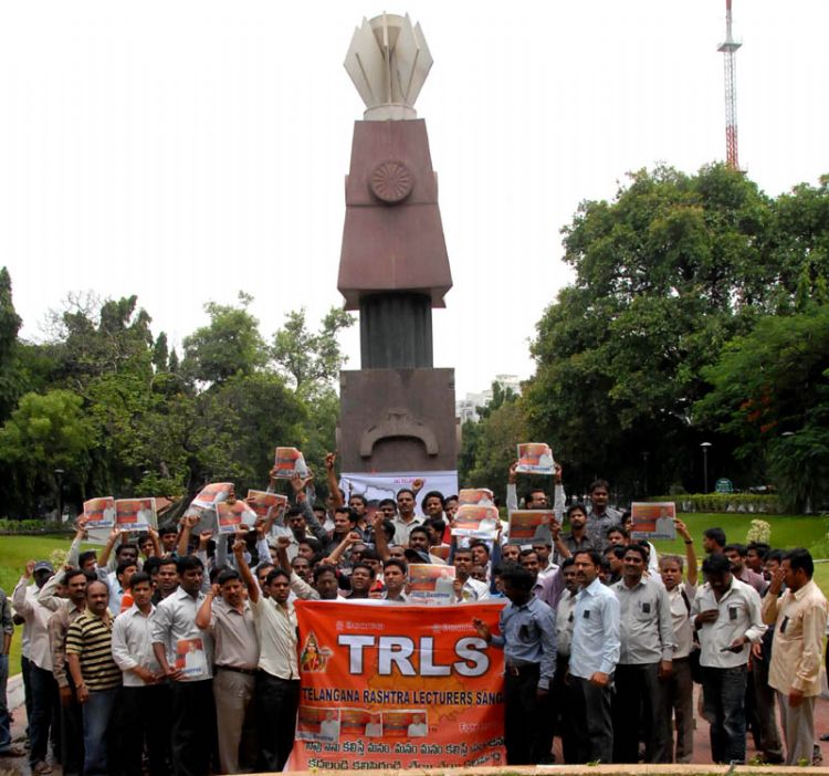 Pro Telangana activists pay homage to Telangana ideologue Professor Jayashankar at Martyrs Memorial at Gun Park in Hyderabad on Wednesday. Prof Jayashankar died of throat cancer on Tuesday and was cremated on Wednesday. INN photos
