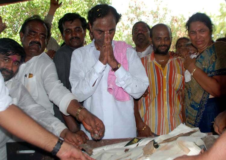 TRS chief K Chandrashekhar Rao paying tributes to Prof.Jayashankar before cremation at Padmakshigutta in Warangal on Wednesday.