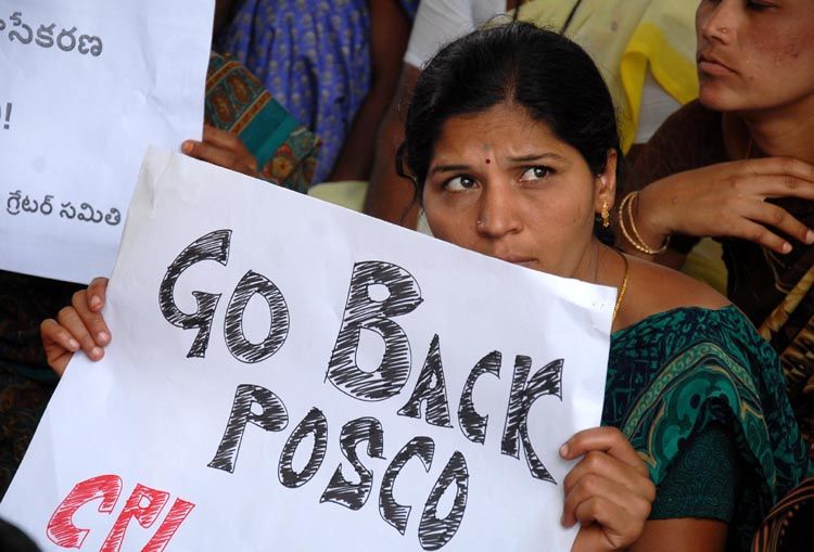 CPI women activists protest against the acquisition land for Rs 52,000 crore Posco steel plant project by the Orissa government, at Indira Park in Hyderabad on Friday. INN Photos