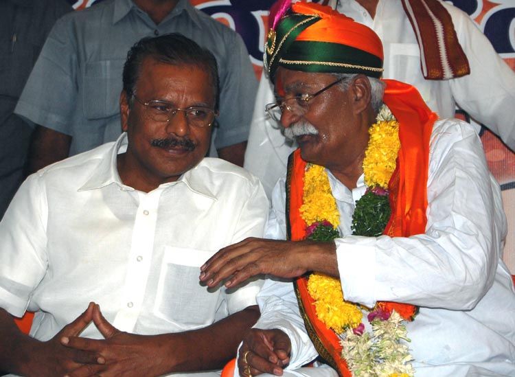 Former BJP leader Ale Narendra sharing a few thoughts with Nallu Indrasena Reddy after rejoining the party in Hyderabad on Monday. INN Photos