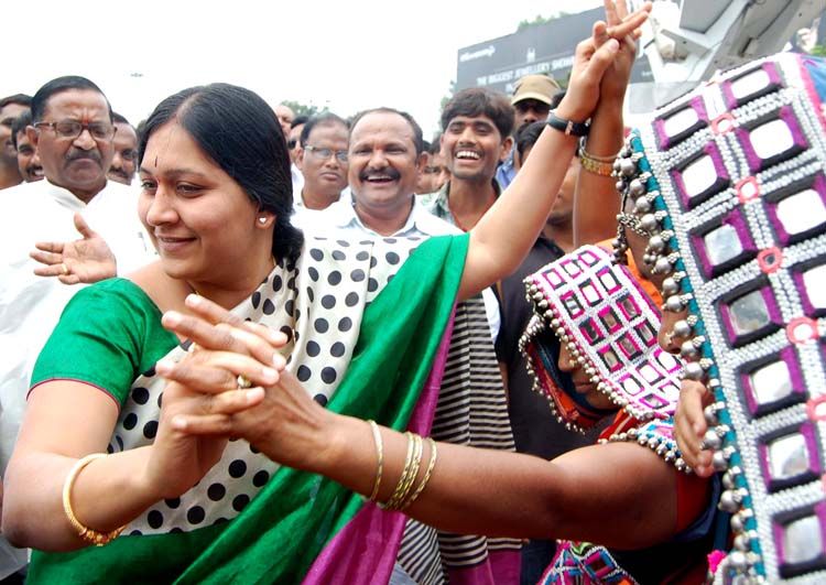 Congress MLA from Mahabubabad Kavita Maloth dances with Lambada women after submitting her resignation to Deputy Speaker Mallu Bhatti Vikramarka at the Gun Park in Hyderabad on Monday. INN Photos