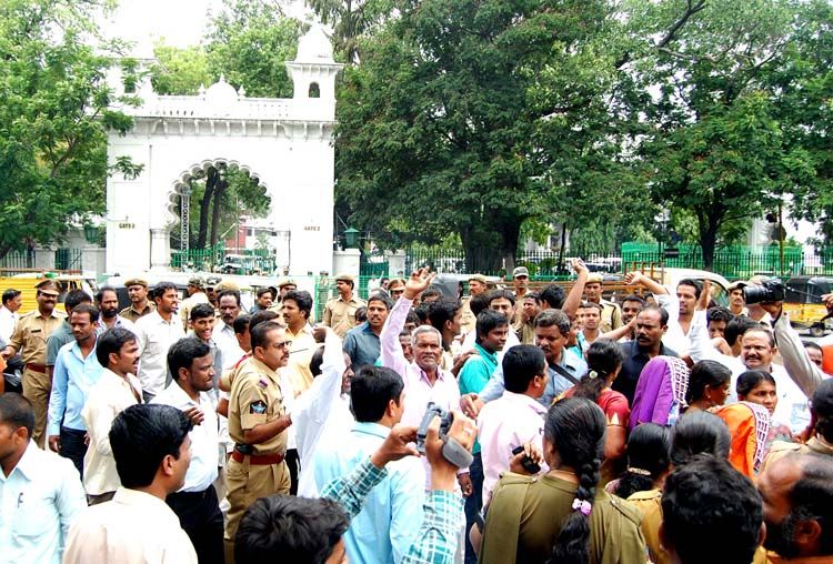 Pro-Telangana activists take out an impromptu rally around the Gun Park in Hyderabad on Monday as Legislators tender their resignations from the Assembly and Council. The rally was taken out even as Section 144 is in place in and around the Executive and Legislatures in the city. INN Photos