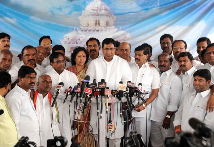 Congress Legislators led by Minister K Jana Reddy, addressing media persons after submitting their resignations to Deputy Speaker Mallu Bhatti Vikramarka at Assembly Media Point in Hyderabad on Monday. INN Photos