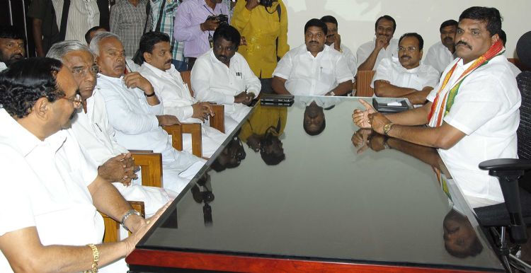 PCC president Botsa Satyanarayana interacts with party MLAs during a meeting at Gandhi Bhavan, Nampally in Hyderabad on Tuesday. INN Photos