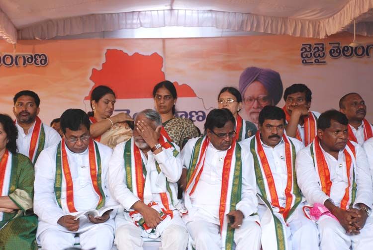 Congress party leaders (Left to right) Geetha Reddy, K. Jana Reddy, K. Keshav Rao, Ponnala Lakshmaiah and other members from the Telangana gesture during their 48-hour hunger strike in support of a separate state of Telangana at Indira Park in Hyderabad on Wednesday.