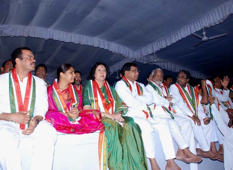 Congress party leaders (Left to right) Geetha Reddy, K. Jana Reddy, K. Keshav Rao, Ponnala Lakshmaiah and other members from the Telangana gesture during their 48-hour hunger strike in support of a separate state of Telangana at Indira Park in Hyderabad on Wednesday.