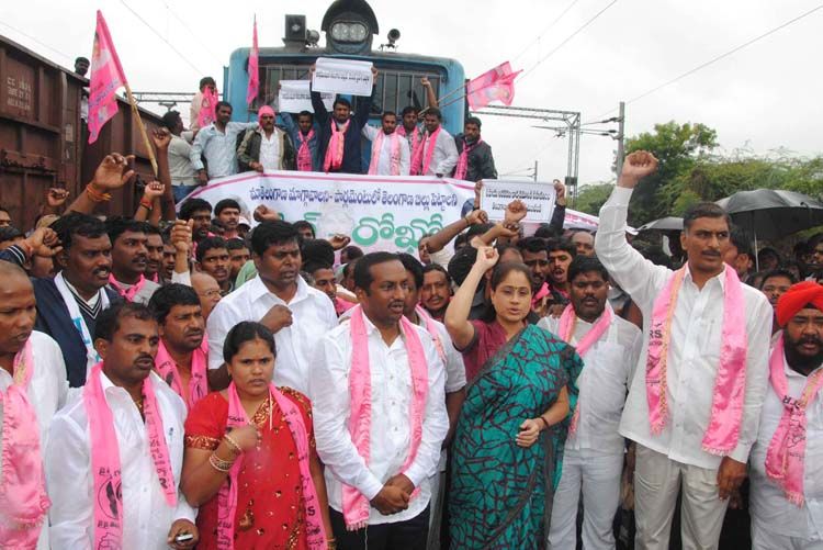 TRS MP Vijay Shanti and MLA Harish Rao along with party workers participating in Rail Rako demanding introduction of Telangana Bill in Parliament at Nagulapally railway station , Patancheru in Medak District about 40 km from Hyderabad. INN Photos