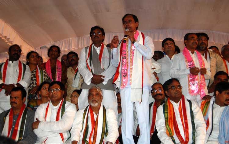 TRS president K Chandrasekhar Rao addressing the gathering at the 48-hour hunger fast camp of Congress Legislators at Indira Park on Thursday. INN Photos