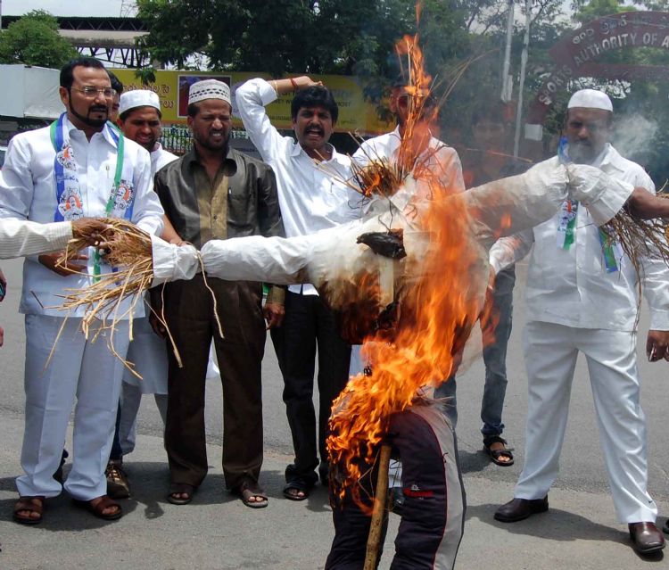 Y.S R Congress Party workers headed by Abdul Rahman Al Attas burning the effigy of Lagadapati Raj Gopal Congress MP in protest against his remark's on Jagan, at basher Bagh Press club in Hyderabad- INN Photos