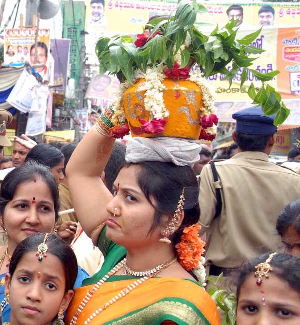 Women carrying traditional religious pots beautifully painted and decorated as an offering to the Goddess,a part of the Ujjaini Mahankali Bonalu festival at Secunderabad - INN Photos