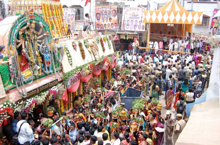 Devotees perform puja at the Mahakali mandir at Lal Darwaza in Hyderabad on Sunday as part of the Bonalu Festival. INN Photos