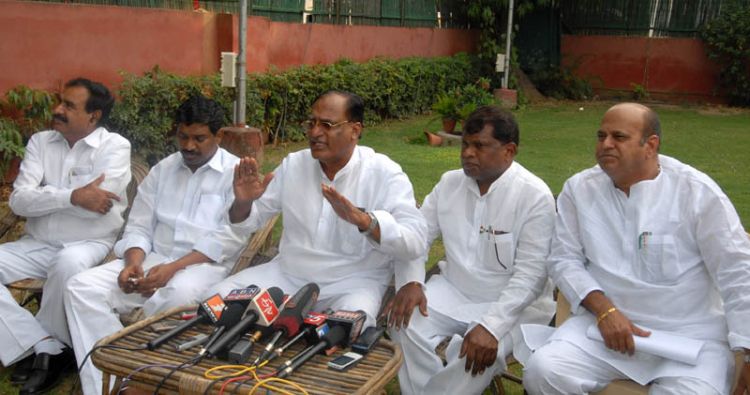 Telangana Congress leaders briefing the press about their strategy at Keshava Rao's residence in New Delhi on Monday.