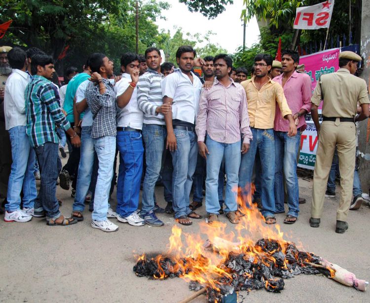 Nizam College students burn an effigy depicting Union Home Minister P Chidambaram in protest of his remarks on a fresh resolution on deletion of Clause 14 F and demanding introduction of Telangana Bill in Parliament in Hyderabad on Wednesday. INN Photos