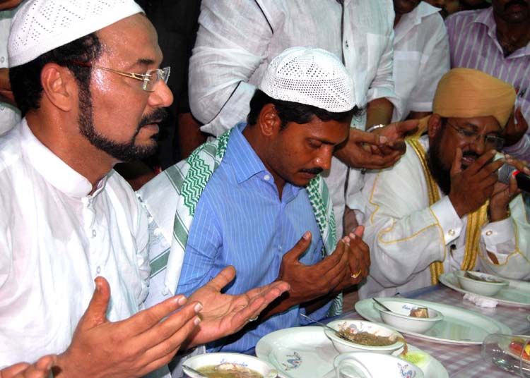 YSR Congress party president YS Jagan Mohan Reddy attends an Iftaar party hosted by YSR Congress minority leader Rahmaan Altas at King Koti in Hyderabad on Tuesday. INN Photos