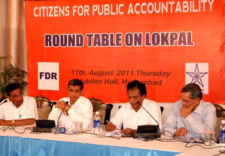 Lok Satta Party president Jayaprakash Narayan addresses a Round Table Conference on the Lokpal Bill and Lokayukta at Jubilee Hall in Hyderabad on Thursday. INN Photos