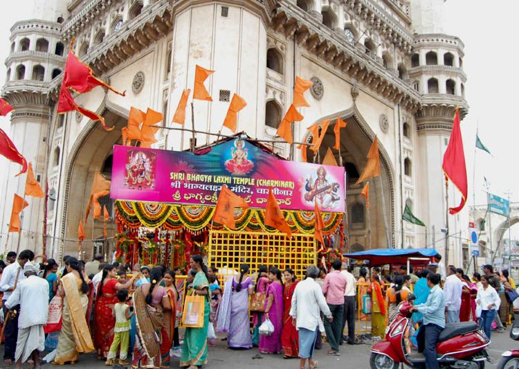 Devotees throng Bhagya Laxmi Mandir to worship the goddess on the eve of Varalakshmi Vratam on Friday near Charminar, Hyderabad -INN Photo