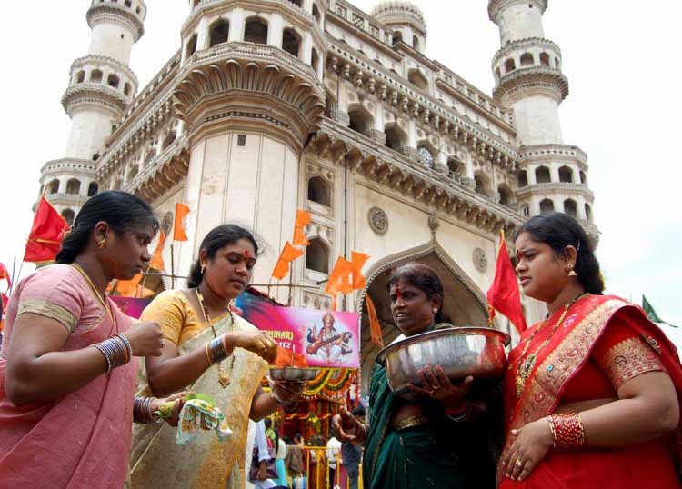 Devotees throng Bhagya Laxmi Mandir to worship the goddess on the eve of Varalakshmi Vratam on Friday near Charminar, Hyderabad -INN Photo