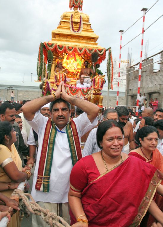 On the occassion of Varalakshmi Vratham, the processional deity of Goddess Padmavathi is taken out in a procession atop Golden Chariot around four mada street of Sri Padmavathi Ammavari Temple, Tiruchanur on Friday evening. TTD EO L.V.Subramanyam, M.K.Singh, C.V&S.O, A.P.V.N.Sarma, Former Executive Officer, Gopalakrishna, DyEO(PAT), Ramachandra Reddy, Supdt Engg, Venugopal, AEO(PAT) and large number of women devotees dragged the radham.