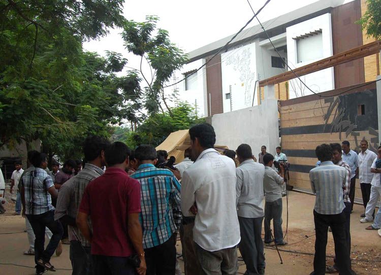 Print and electronic media persons waiting out side Jagan's Lotus Pond residence and party office in Jubilee Hills as CBI teams continue its search inside the home. INN Photos