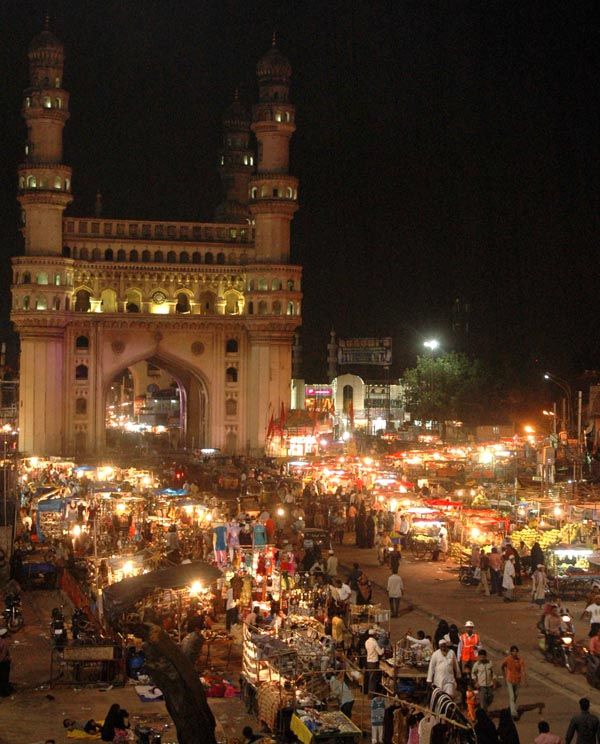 The illuminated Mecca Masjid and other monuments in the Old City presenting a beautiful view of night shopping for Ramazan Eid - INN Photos