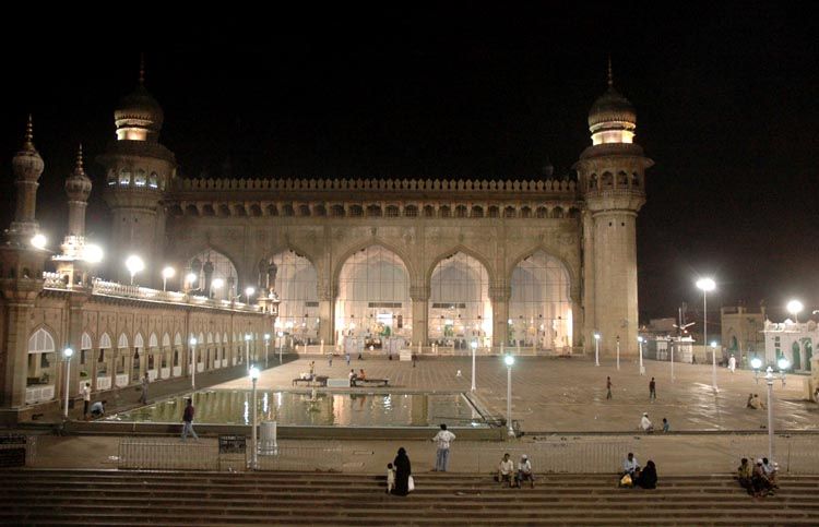 The illuminated Mecca Masjid and other monuments in the Old City presenting a beautiful view of night shopping for Ramazan Eid - INN Photos