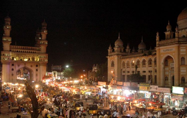 The illuminated Mecca Masjid and other monuments in the Old City presenting a beautiful view of night shopping for Ramazan Eid - INN Photos