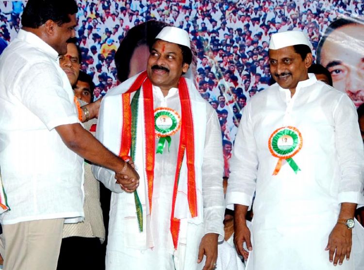 Chrinajeevi being welcomed by APCC president Botsa Satyanarayana, Chief Minister N.Kiran Kumar Reddy on the occasion of PRP's merger with Congress at Gandhi Bhavan here on Monday - INN Photos