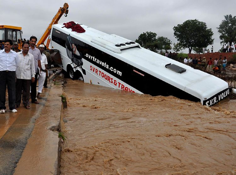 A Volvo bus with 27 passengers from Hyderabad to Tirupati has got stranded in the swirling flood waters of Dovachinta Vagu (rivulet) in Orvakallu mandal of Kurnool disrict in the early hours of Wednesday. All the passengers and crew of the bus have been saved by the timely help of nearby Nanuru villagers.