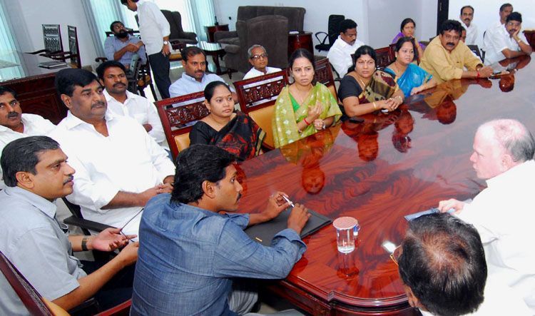 YSR Congress president and Kadapa MP Y S Jaganmohan Reddy holding a meeting with loyalist MLAs and MPs at the party headquarters in Hyderabad on Sunday.