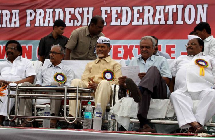 TDP President N Chandrababu Naidu and other leaders at the protest meets at Exhibition Grounds organised by the All India Textiles Federation here on Wednesday - INN Photos
