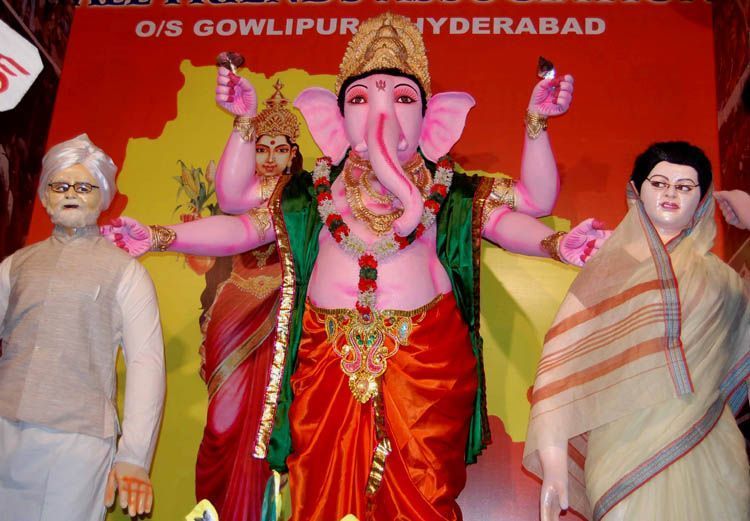 Telangana Ganesh installed at Gowlipura in Hyderabad has become a crowd puller. Lord Ganesh is seen pulling the ears of Prime Minister Dr Manmohan Singh and UPA chief Sonia Gandhi - INN Photos