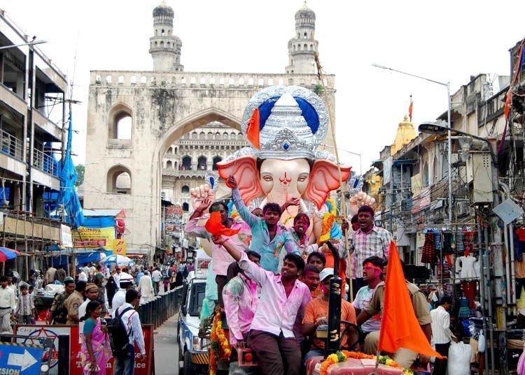 Devotees taking the idols of Lord Ganesha for immersion through Charminar in Hyderabad on Friday. The Nimajjanam ceremony is scheudled on Sunday and police have made elaborate security arrangements to see the event pass off peacefully - INN Photos