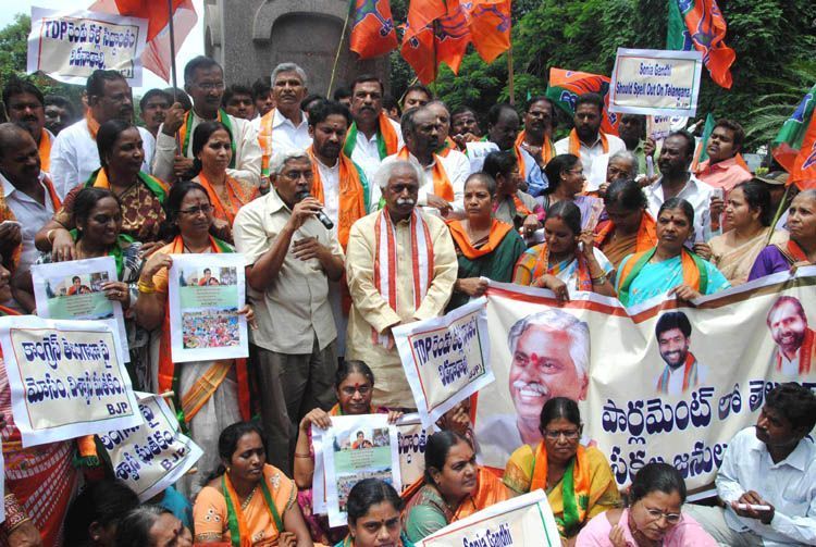 BJP leaders along with Telangana JAC chairman Prof Kodandaram staging a protest at Gun Park here on Tuesday demanding introduction of Telengana Bill in Parliament - INN Photos