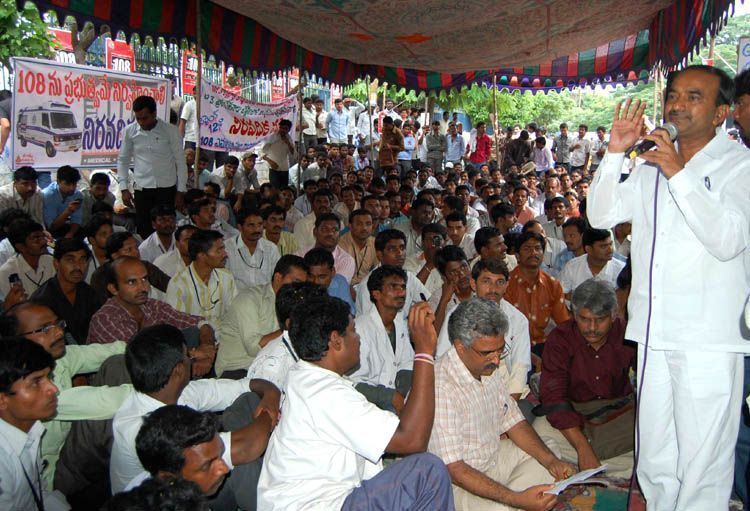 TRS floor leader E Rajender addressing the GVK-EMRI 108 staff staging a dharna at Indira Park on Wednesday demanding payment of salaries - INN Photos