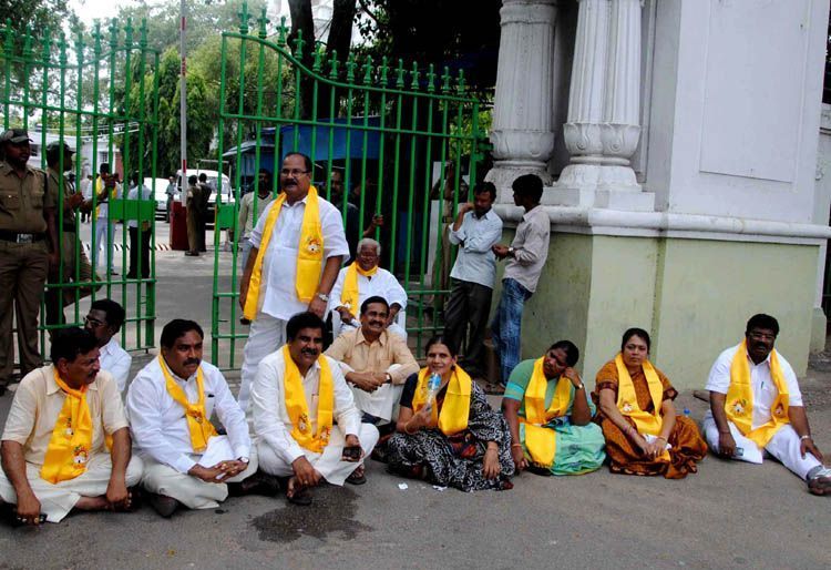 Telengana TDP legislators staging a protest in front of the AP Legislative Assembly here on Thursday demanding introduction of Telengana Bill in Parliament - INN Photos