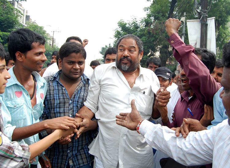 Hero of 'Poru Telangana' movie R Narayana Murthy mobbed by his fans at Usha Mayuri theatre in RTC X roads, Hyderabad. Later, he returned in a RTC Bus - INN Photos
