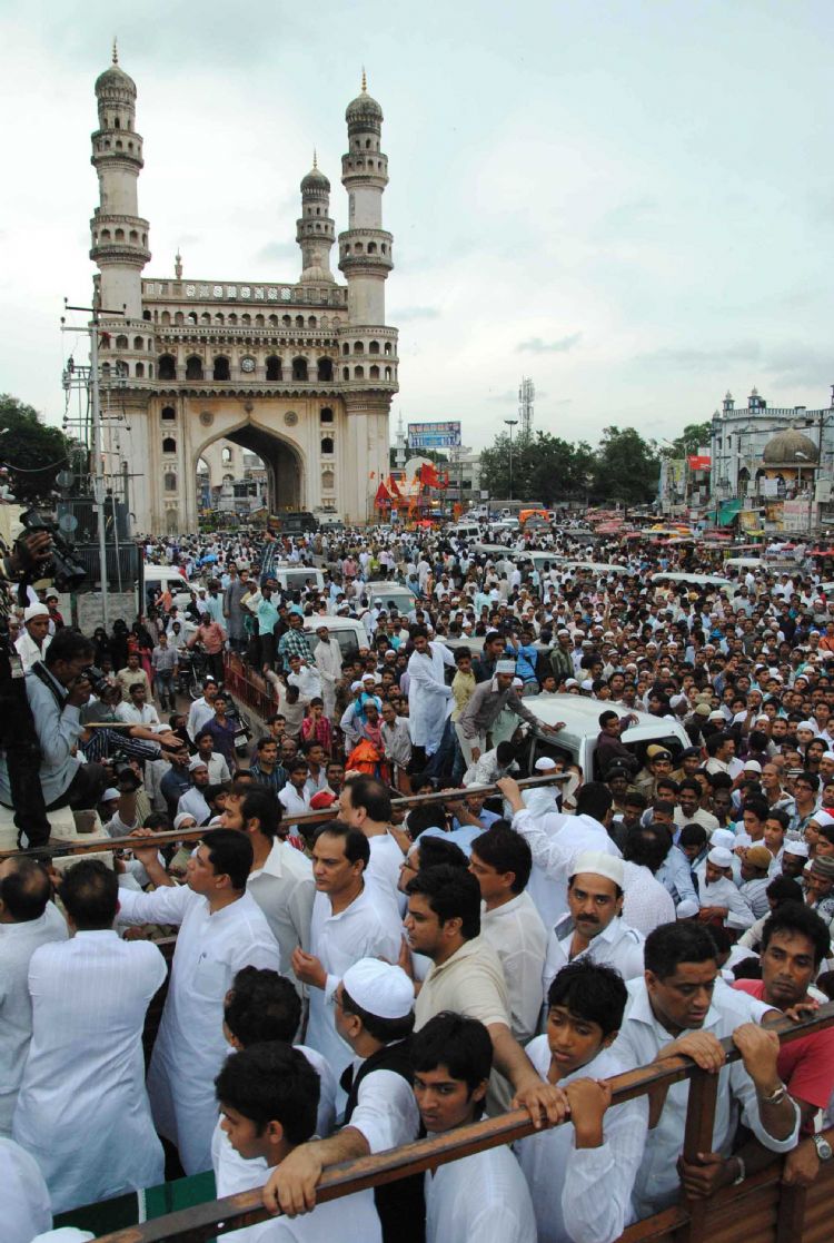 Hundreds of people gather for Mohammed Azharuddin's son Mohammed Ayazuddin's Namaaz-e-Janaza (last prayers) at Mecca Masjid in Hyderabad on Friday - INN Photos