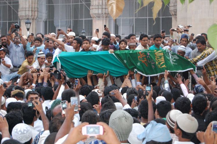 Hundreds of people gather for Mohammed Azharuddin's son Mohammed Ayazuddin's Namaaz-e-Janaza (last prayers) at Mecca Masjid in Hyderabad on Friday - INN Photos