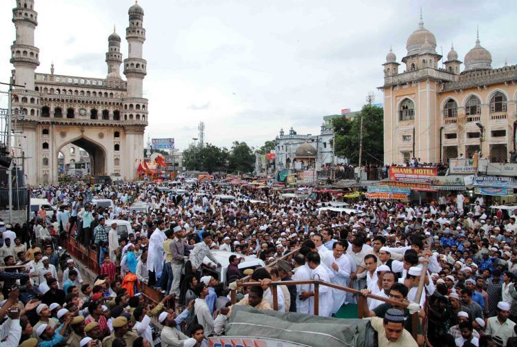 Hundreds of people gather for Mohammed Azharuddin's son Mohammed Ayazuddin's Namaaz-e-Janaza (last prayers) at Mecca Masjid in Hyderabad on Friday - INN Photos