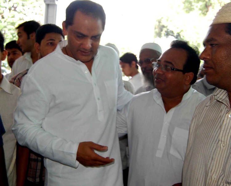 Ex-cricketer and Congress MP Mohammed Azharuddin at Royal Mosque, Public Garden, here on Sunday on the occasion of Fateha-e-Sayyum (third day prayers) conducted for his late son Mohammed Ayazuddin who was killed in a road accident - INN Photos