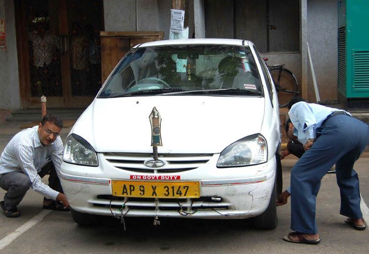 Telangana employees of Housing Board Corporation deflating the tyres of vehicles belonging to Andhra officers here on Monday - INN Photos