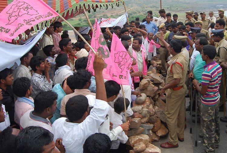 Telangana agitators set up a road block by building a boulder wall on the border of Nalgonda, Guntur districts near Nagarjunasagar to prevent the entry and exit of vehicles plying between Telangana and Andhra on Monday.