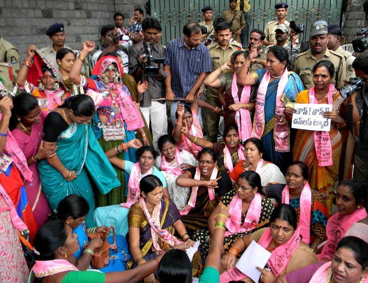 TRS Mahila wing activists protest in front of former Congress MP Renuka Chowdary's residence at Banjara Hills on Tuesday - INN Photos