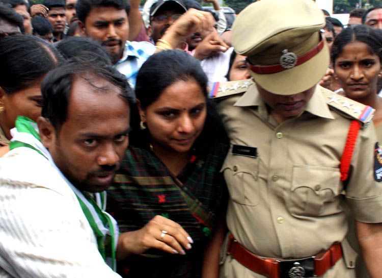 Telangana Jagruti President Kavita along with Telangana Lecturers' Sangham members forms 'Human Chain' near assembly on Tuesday demanding statehood for Telangana region. Later, they were arrested by the police - INN Photos